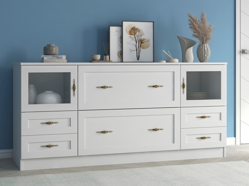 Используемый материал: корпус - ЛДСП, фасад ЛДСП в рамке МДФ, ламинированное ДВП, стекло, стандартная фурнитура