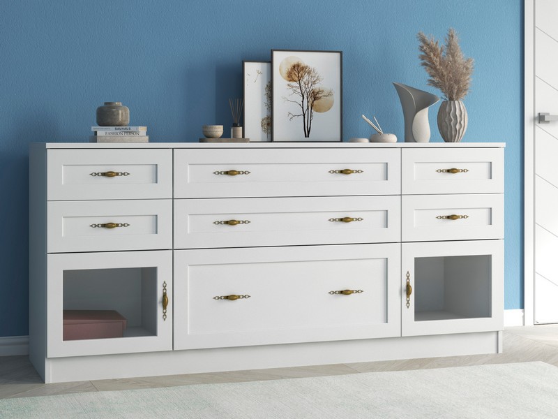 Используемый материал: корпус - ЛДСП, фасад ЛДСП в рамке МДФ, ламинированное ДВП, стекло, стандартная фурнитура