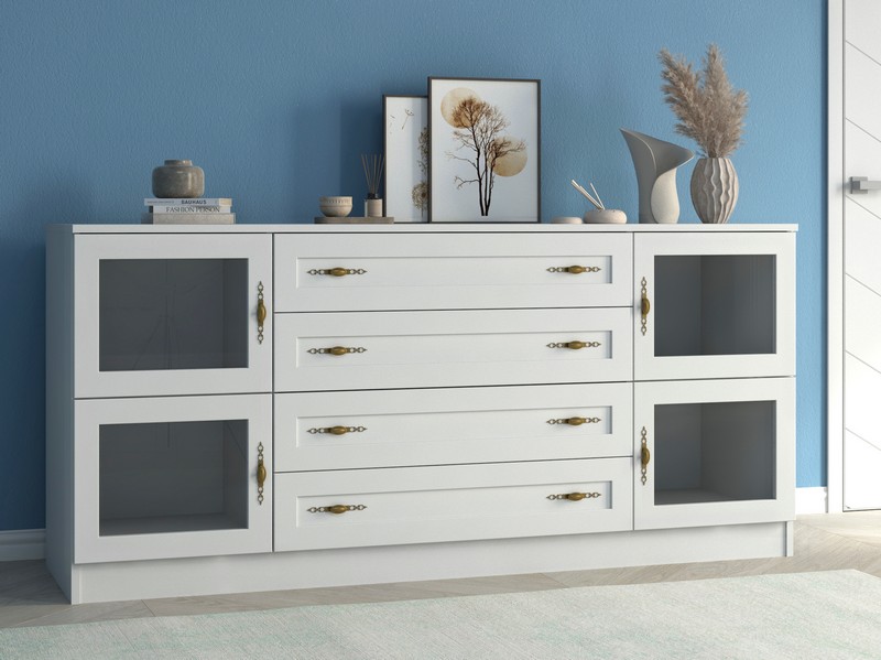 Используемый материал: корпус - ЛДСП, фасад ЛДСП в рамке МДФ, ламинированное ДВП, стекло, стандартная фурнитура