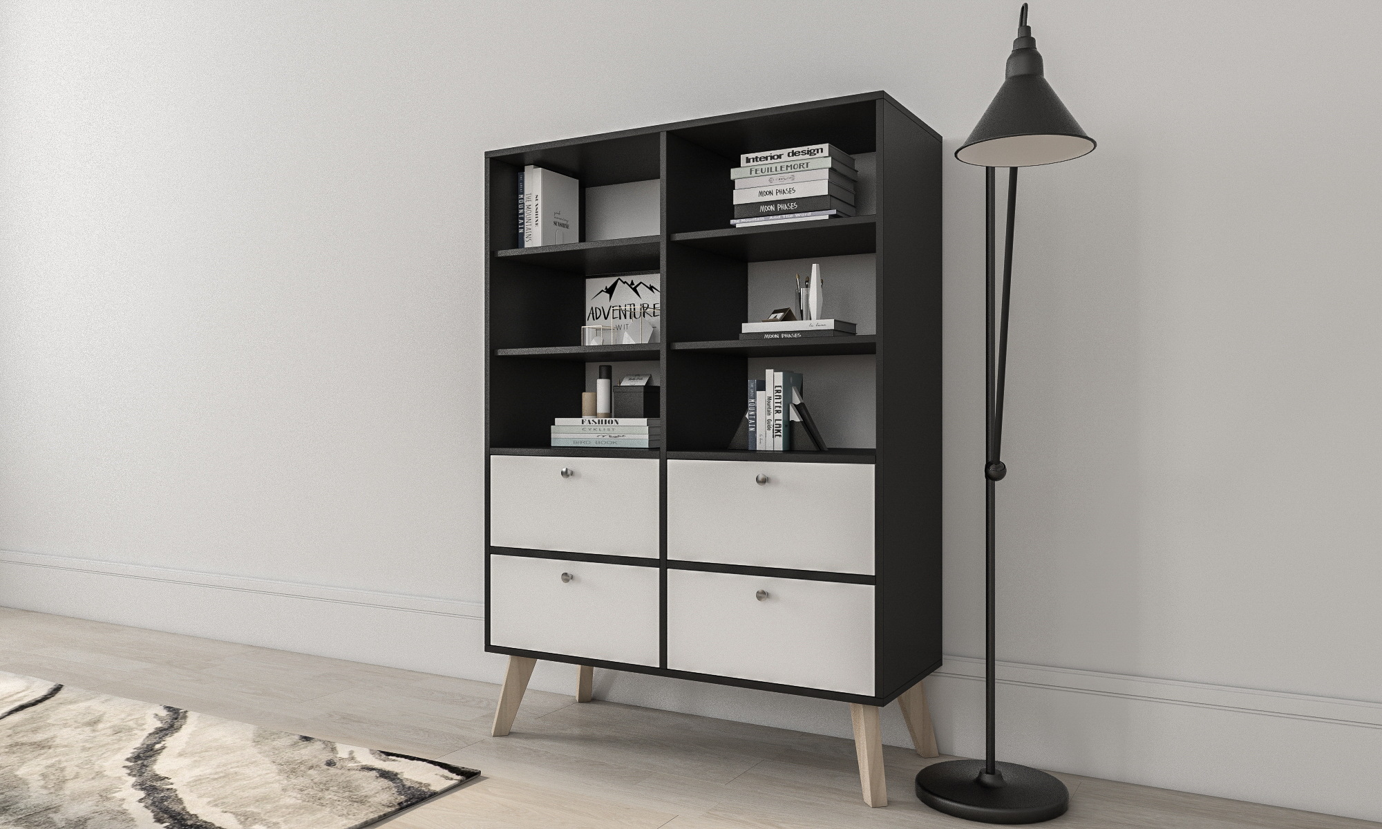 Используемый материал: корпус и фасад изготовлен из ЛДСП. Комод: 4 выдвижных ящика + 6 открытых ниш. Материал ножек - бук (массив дерева). Высота ножек 200 мм.