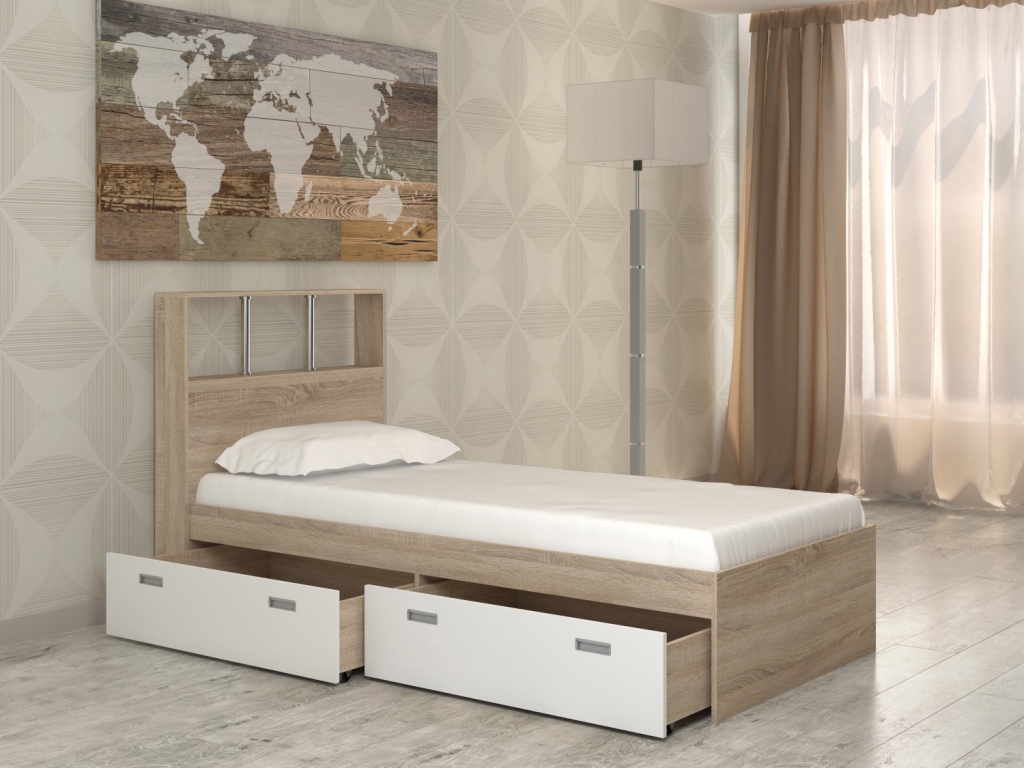 Используемый материал: ламинированный ДСП, ЛДВП, стандартная фурнитура. Ящик выкатной на кроватных роликах (в стандарте только с одной стороны). Ручки врезные. Матрас в комплектацию изделия не входит.