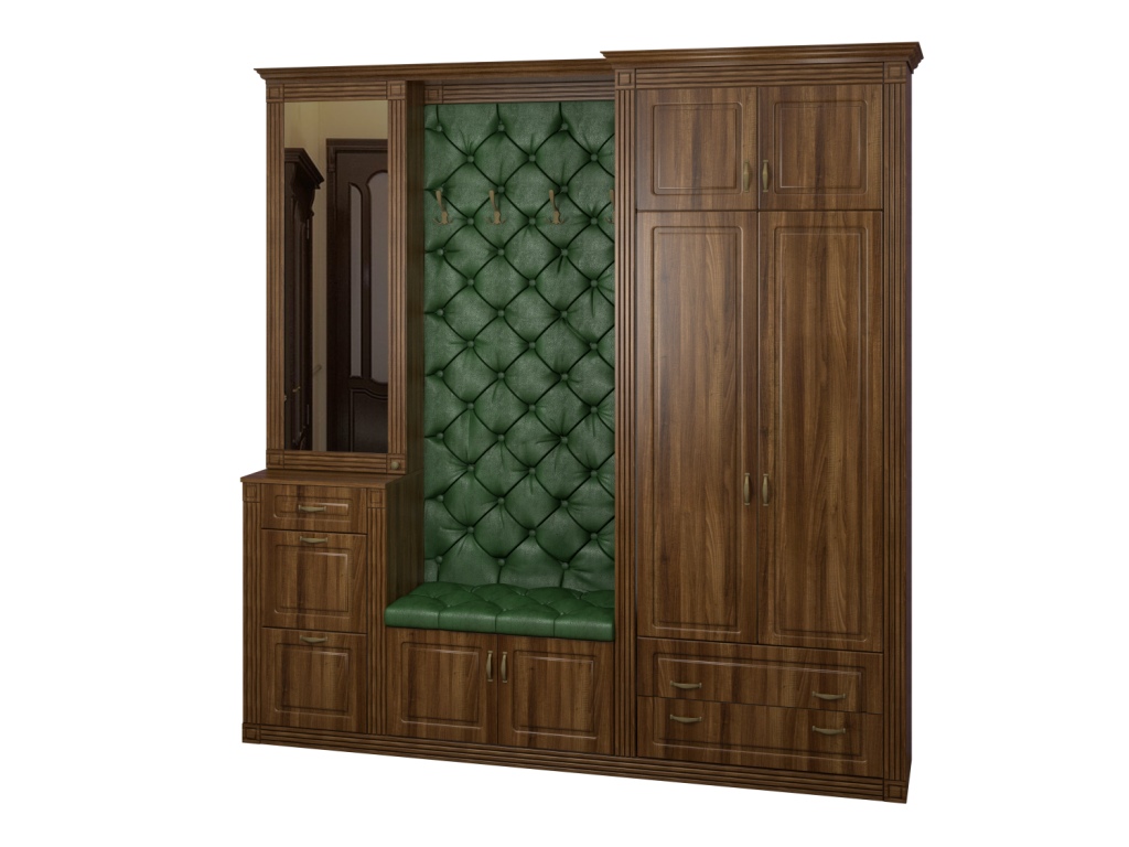 Используемый материал: корпус - ламинированное ДСП 16 мм; зеркало; фасады, карниз и пилястры - МДФ; ЛДВП. Мягкая панель декорирована каретной стяжкой. Доступен выбор вариантов ткани для обивки: это может быть велюр, рогожка или экокожа различных цветов.