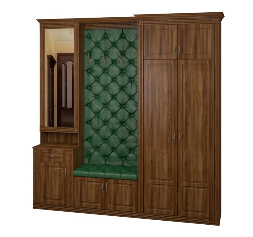 Используемый материал: корпус - ламинированное ДСП 16 мм; зеркало; фасады, карниз и пилястры - МДФ; ЛДВП. Мягкая панель декорирована каретной стяжкой. Доступен выбор вариантов ткани для обивки: это может быть велюр, рогожка или экокожа различных цветов.