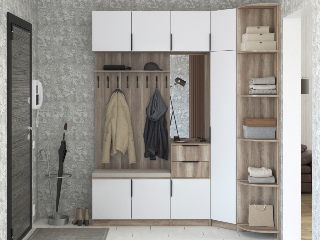 Во вкладке "Выбрать модули" Вы можете подобрать различные по комплектации шкафы, вешалки, угловой элемент. Модульная система поможет подобрать вам необходимые модули, с учетом размеров помещения, планировки.