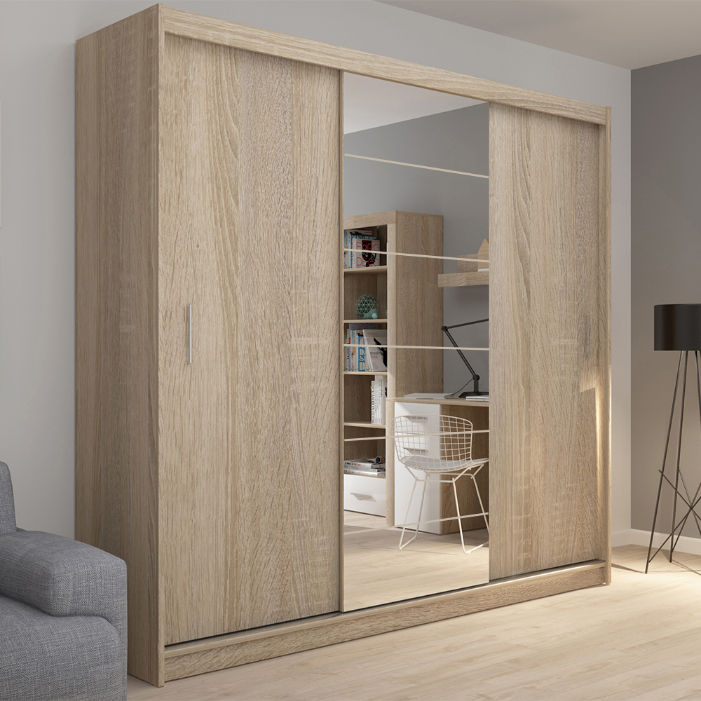 Используемый материал: ламинированное ДСП 16 мм, ламинированное ДВП, выбор направляющих от "эконом" до класса "люкс", ручки рейлинг, зеркала. Стандартно для шкафа установлена бюджетная система направляющих дверей эконом - Топ-лайн (колесо только наверху, внизу паз-кораблик). За дополнительную плату можно установить усиленную систему направляющих ТОП - Альянс (колеса внизу и вверху), а также полностью алюминиевая конструкция люкс - Версаль (периметр каждого фасада в алюминиевом профиле - ручке). Направляющие Альянс и Версаль рекомендуется для шкафов высотой более 2200 мм.