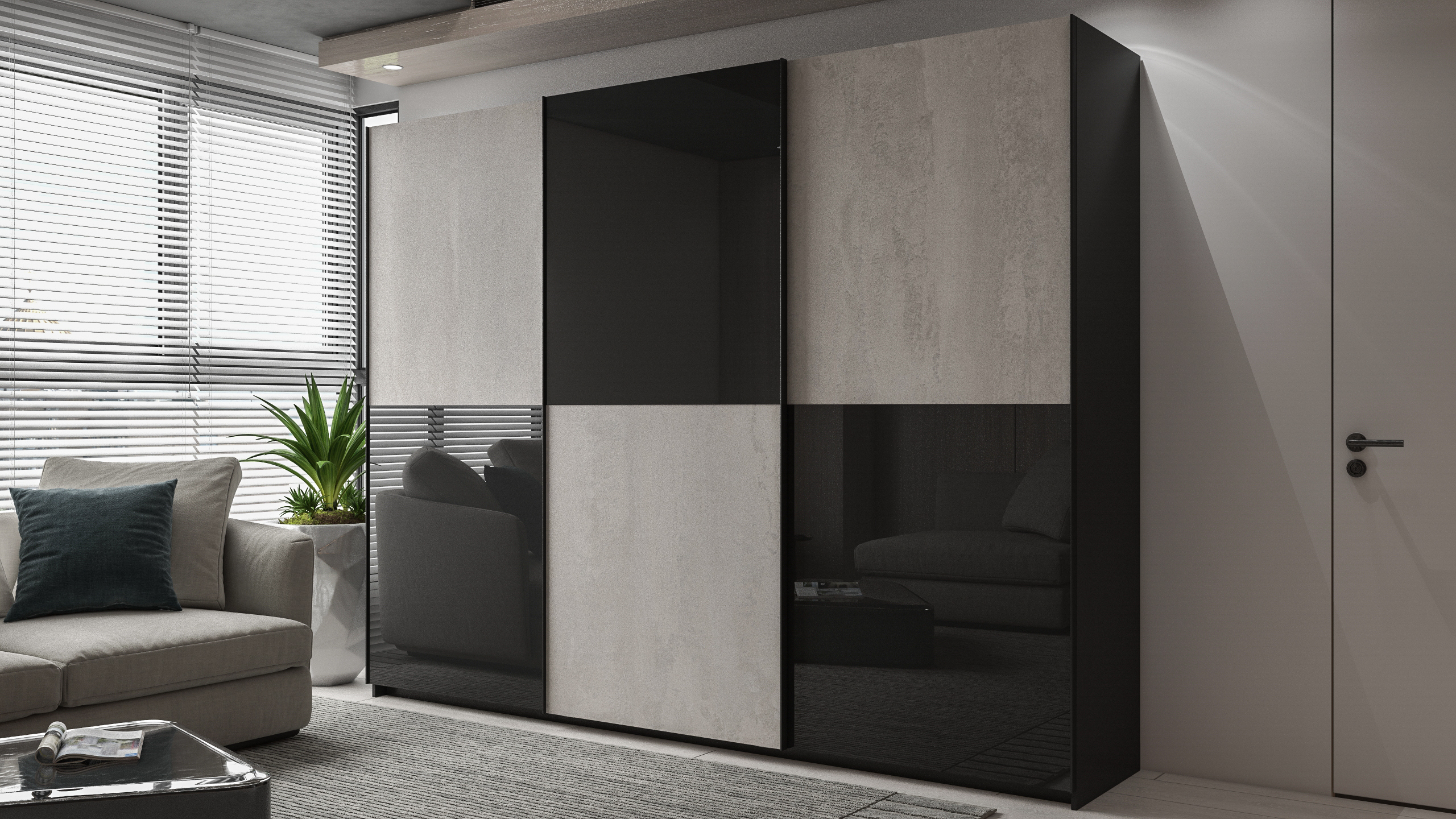 Система плавного закрывания: доводчики для плавной остановки при открывании и закрывании фасадов; центральный доводчик средней двери с возможностью открывания в обе стороны; нижний демпфер стабилизирует движение фасада при срабатывании доводчика сверху.