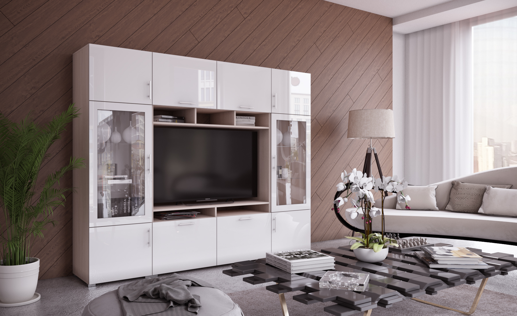 Тумба ТВ: двери открываются вниз, за каждой двери по 1 полке.Колонка комбинированная: за дверью со стеклом 2 стеклополки, за глухими дверями по 1 отделению. Шкаф навесной: двери открываются вверх на газлифтах, за дверьми по 1 отделению.