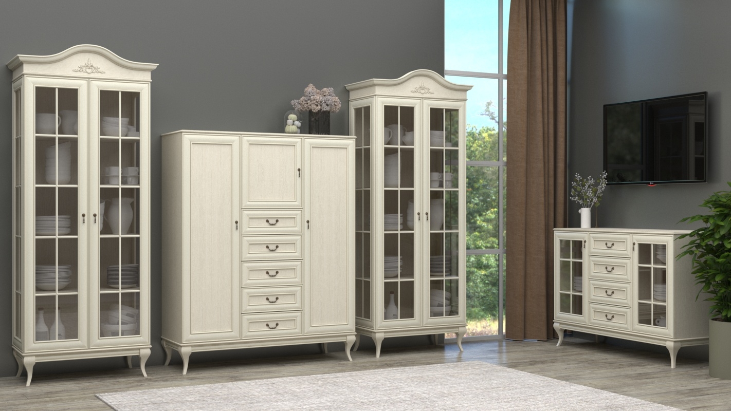 Для аристократичной гостиной идеальным решением станет серия мебели МК 62. В ней представлены различные по комплектации шкафы, горки, комоды, тумбы, буфеты. В качестве цветового решения для отделки фасадов можно выбрать светлый оттенок «дуба седан» или темный «орех». Модульная система позволяет подобрать и купить мебель с учетом планировки и размеров гостиной, а также потребностей живущих в доме. Объемные молдинги на дверцах и ящиках, оригинальные ручки-капли и подвески, высокие ножки в сочетании с нежной фактурой натурального дерева наделяют каждый предмет легкостью и изысканностью, а продуманные конструкции позволяют качественно и рационально организовать пространство гостиной.